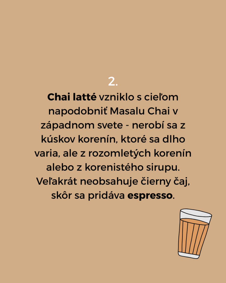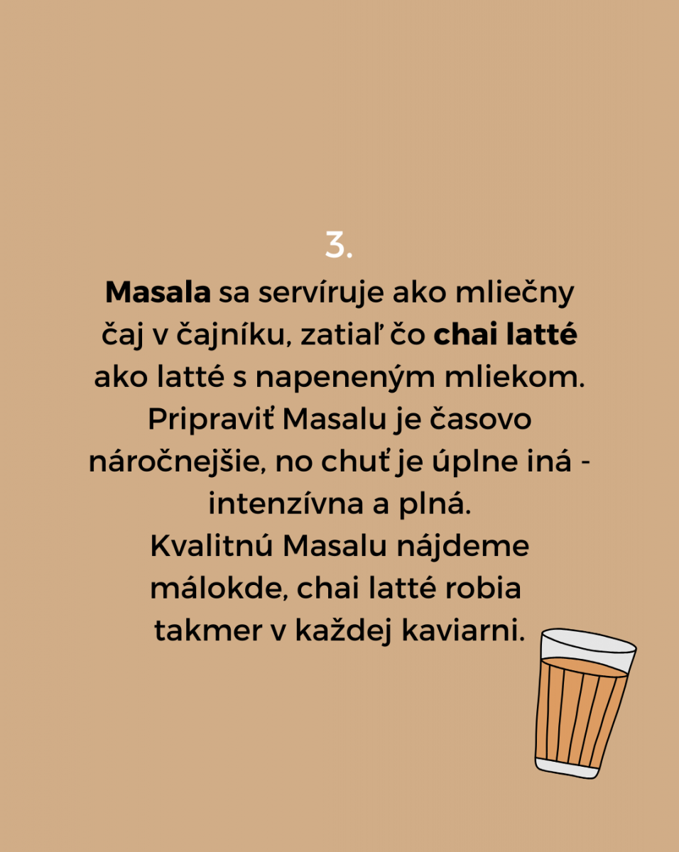 Chai latté vzniklo napodobením Masaly, ktorá by bolo časovo menej náročná. Do tohto náopja sa namiesto čierneho čaju, ktorý je nevyhnutnosťou Masaly, pridáva častokrát espresso. Nevýhodou chai latté je, že je väčšinou zo sirupov, ktorých obsah korenín je nízky a sú veľmi sladké. Vyťažiť z korenia ich zdraviu prospešné látky je najlepšie dlhým varom - vďaka čomu u nás okrem plnej chuti víťazí Masala aj zdravotnými pozitívami.